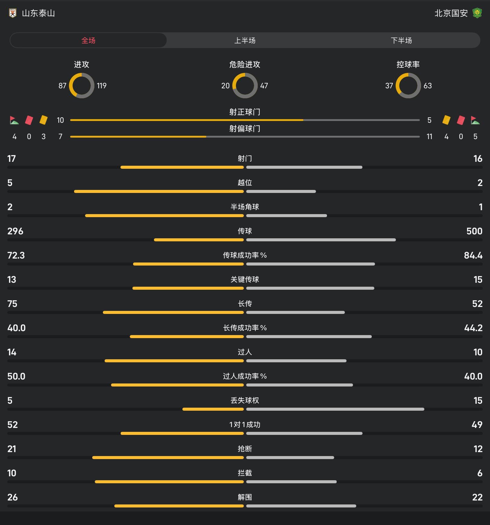 全场数据方面,两队射门数对比为17-16,但射正数泰山10-5大幅度领先国安队,而泰山队10次射正取得6粒进球,也展现了极高的效率。控球率方面,北京国安是领先的一方,控球率为63%;泰山队的控球率则为37%。